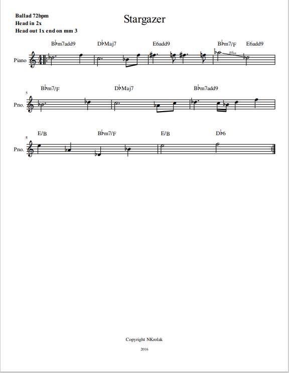 Many people have asked me to see this chart and have been baffled by its simplicity when I showed them. The song actually contains only two chords Bbm7 and E6 but feels like there is so much more. Perhaps this is caused by the aural illusion created by shifting bass notes, or perhaps it’s just my dad stopping by to say hi.